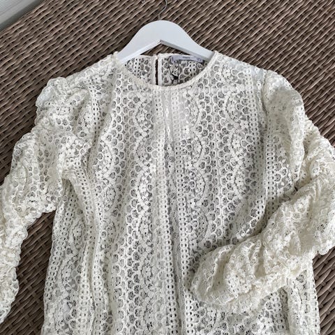 Deilig sommerbluse i bomull med fine detaljer. Elastisk blondekant nederst; den kan justeres for passform på blusen.