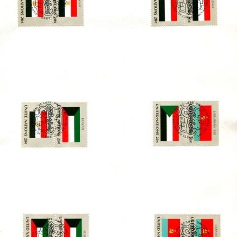 90% rabatt: F.N. New York 1981 Flaggutgave II (FDC), Michel nr. 373-88, 4 A4-ark med 24 vannrette par i ulike kombinasjoner, i alt 3 av hvert merke, med FDC-stempel.