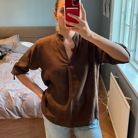 Lys blå skjorte eller bluse i 100% lin, perfekt for sommeren. Veldig fin passform, brukt 1 gang. Ingen bruksmerker. Kan sendes eller hentes i Stavanger.