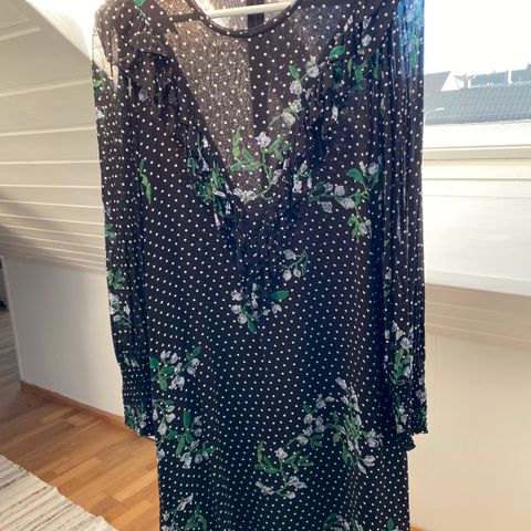 Selger kjempefin svart selskapskjole fra Ganni. Har et asymmetrisk mønster. Står ikke størrelse inni kjolen, men vil si den er en L. Ingen bruksmerker, kun brukt et par ganger. Kan sendes eller hentes i Stavanger.
