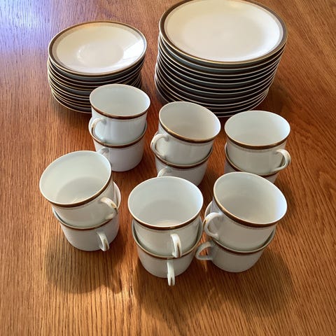 I alt 12 sett. Selges samlet og sender gjerne, men best å hente. Porsgrunn grønt stempel. Serviset har en brun kant og en gull kant.