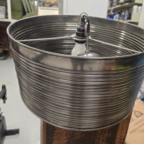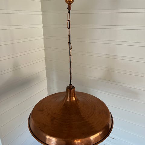 Industriell taklampe i metall med en sølvfarget finish. Lampen har en robust design med kjedeoppheng, ideell for å gi et moderne preg til ulike rom. Passer godt i både stue og kjøkken.