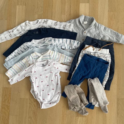 Klespakke i størrelse 68. Settet inkluderer en langermet omslagsbody og bukser i beige og blekrosa farger. Laget av myk bomull som gir komfort for babyens sensitive hud. Perfekt for daglig bruk.Pent brukt