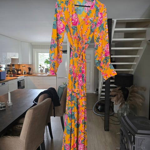 Kjole i omslagsfasong. Gul med blomstermønster. 100% Viskose. str. 42