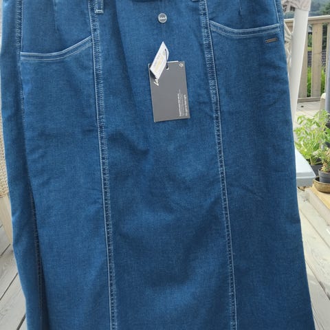 Dongeriskjørt i lett 100% lyocell/tencell fra Gardeur. Størrelse 48. Sidelommer, skjult glidelås bak. Pynteknepping foran. Litt utskrådd i fasong. Lengde: 72 cm.