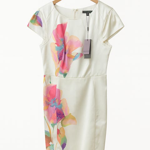 Pent brukt Coast festkjole til salgs. Str. 14 som tilsvarer str. 42. Pastellfarget. Nydelig blomster i stoffet. Fôret/underskjørt. Silke.