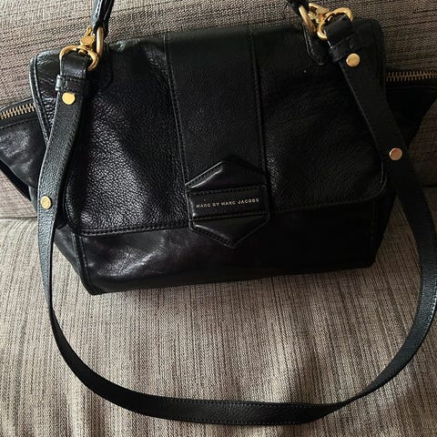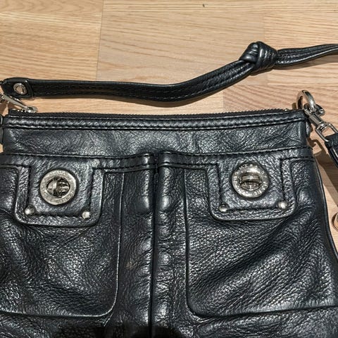 Svart veske fra Marc Jacobs i skinn. Godt brukt men har mange år igjen. Skinnet har har slitasje øverst på vesken, samt bruksmerker. Gulldetaljer har lite slitasje, innsiden er hel og fin, ingen flekker eller lukt. Håndtak kan ikke taes av, skulderrem kan taes av. Kan hentes i Trondheim evt sendes.