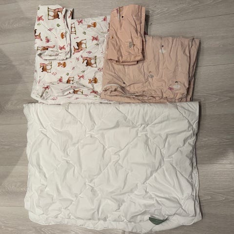 Dyne 140x100 cm, svært lite brukt da det har vært hos besteforeldre. Dynetrekk og putetrekk med mammut og dinosaurmotiv.