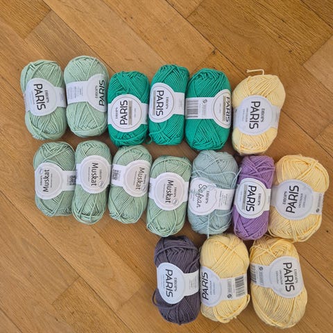 Selger garn jeg ikke har bruk for. Har 8 stk Drops Muskat i fargen 02 og 1 stk Drops Muskat farge 08. To stk Drops Safran farge 50. Følger med rest av Drops Muskat i fargen 02 ved kjøp av alle 8 stk i samme farge, tilsvarende for Drops Safran (eventuelt hvis du kjøper opp alt så får du det selvfølgelig med også). Pris oppgitt er pris per nøste, du får alt på bildet til 180 kr :)
