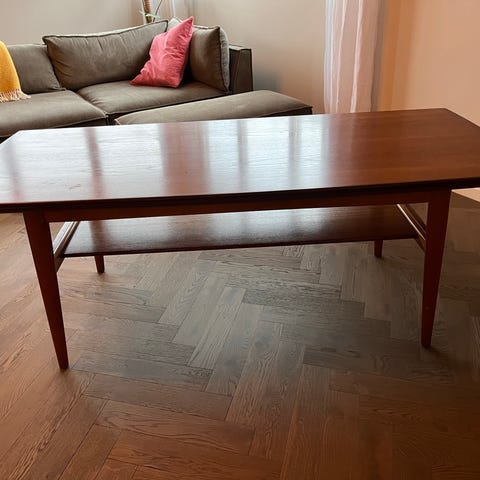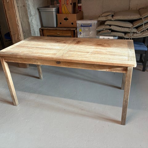 Selger et fint, stort hagebord (Lengde ca 202 cm, bredde ca 87 cm, høyde ca 75 cm) i sertifisert teak. Understell i rotting. Bordet er noen år gammelt, men har aldri stått ute bortsett fra nå til fotografering, kun i en kjeller med duk over. Framstår omtrent som nytt. Det ble rett og slett for stort for oss. Ny pris var ca. 5400,-. Pris kr. 1600,-.