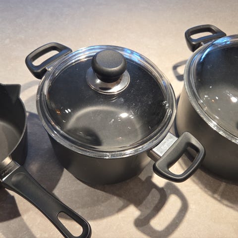 Scanpan kjeler med glasslokk, pent brukt. Den største er ca 5-5.5 liter, den minste ca 4-4,5 liter.