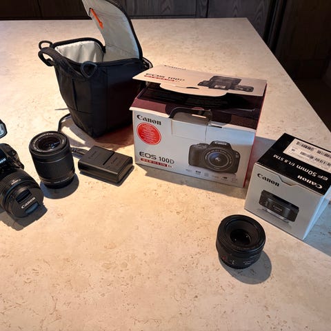 Selger min lite brukte Canon eos 100 D med ekstra portrett linse. Grunnen at jeg selger kamera er at jeg bruker den aldri.