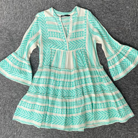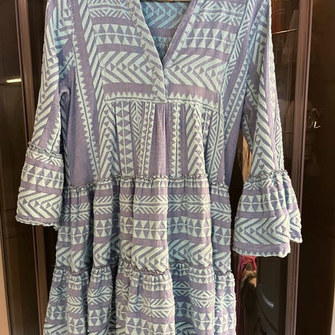 Selger en helt ubrukt Devotion Twins “Ella Dress Short” i størrelse M. Vakker blå/hvit fargekombinasjon (B. Blue/Blue) med karakteristisk etnisk broderi.