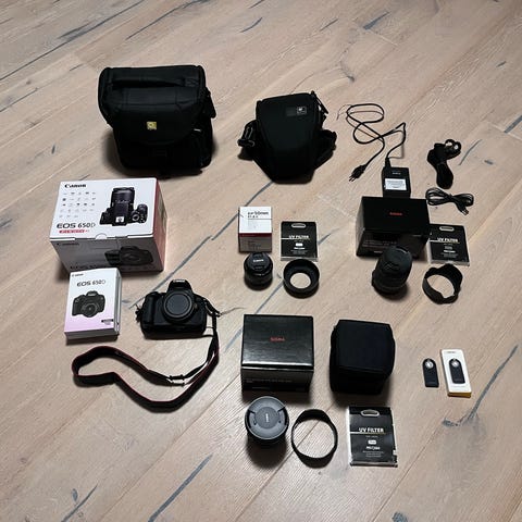 Selger en komplett og godt vedlikeholdt kamerapakke som passer både nybegynnere og viderekomne. Utstyret er lite brukt og har kun vært benyttet innendørs til lett produktfotografering i en kort hobbyperiode. Alt fungerer som det skal og er i svært god stand.