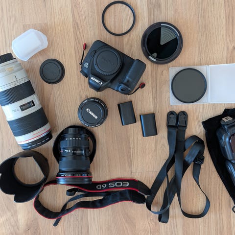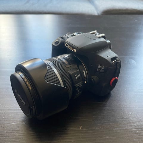 Kamerahuset er et Canon EOS 850D, med original batteri og lader, samt SD-kort. Objektivene som følger med er Canon EF-S 17–55mm f/2.8 IS USM, en lyssterk og skarp zoom, og Canon EF 50mm f/1.8 STM – fin til portrett og detaljbilder. Det følger også med et stativ som fungerer godt til både produktfoto og vanlig bruk.