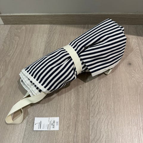 Vintage / retro ubrukt picnic teppe blå bunn med friske farger., fleece med svart plastlignende stoff bak . L 167 cm B127 cm. Brettes sammen og festes med borrelås. Håndtak til å bære. Kan sendes med Post Nord 69 kr