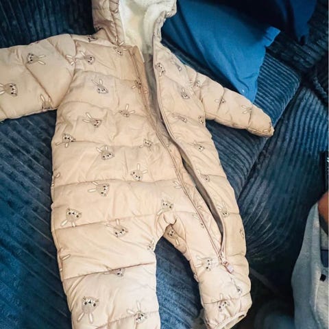 Polarn O. Pyret vinterdress i størrelse 74, designet for jenter. Dressen er rosa og laget for å gi varme og komfort til små barn. Den har hette og glidelås foran for enkel påkledning.