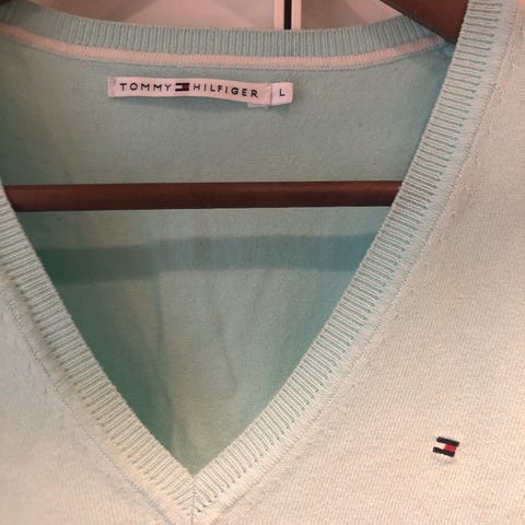 Selger en fin og enkelt genser med v-hals fra Tommy Hilfiger i en delikat brunfarge. Størrelsen er noe liten, mer en Medium enn en Large. Brukes ikke lengre å blir bare liggende i skapet. Har en til i lys turkis å denne kan medfølge for ett lite tillegg i prisen - to stk gensere for 300kr!:)