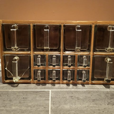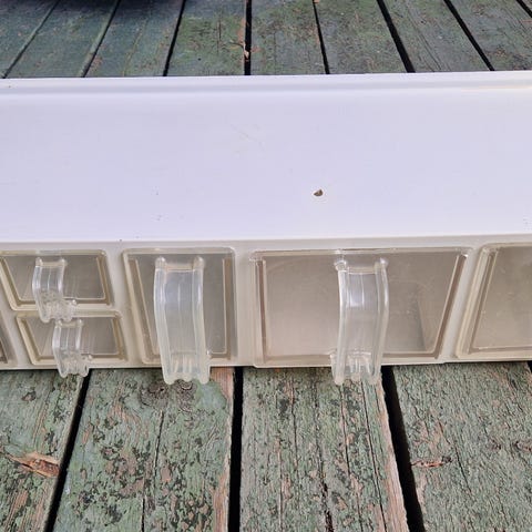 Speserihylle/ kjøkkenhylle for oppbevaring av matvarer og krydder. Skuffene er laget av transparent plast. Den har i alt 8 store og 8 små skuffer. Passer godt til bruk på kjøkkenet. Kan leveres i midtre Vestfold.