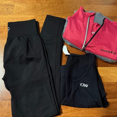 Sports bh, tights, sorts og overdeler er i størrelse S. Jakke i M og singlet i XS.