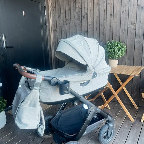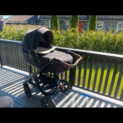 Pent brukt Stokke Trailz med mye bruk igjen. Komplett med ligge- og sittedel som kan vendes. God å trille og kommer frem overalt, overlegen både i litt terreng og i snø. Forhjulene er svingbare og kan låses i posisjon. Det er nylig skiftet slanger og dekk på begge bakhjul. Den ene hjulkapselen bak er borte, men har ingenting å si for funksjon (se bilde) og oppbevaringen under med noe synlig slitasje.