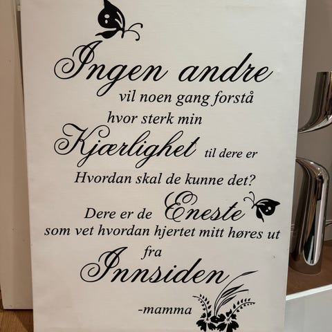Tenåringen selger to skilt av en slags lerret. Ett på 47x15,5 cm og ett på 35x17 cm. 40 per stk eller 60 samlet.