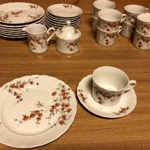 Selger et klassisk og dekorativt servise i hvitt og grått fra tyske Eschenberg Bavaria. Elegant blomstermønster i tidløs stil.