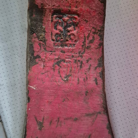 Gammelt øksehode. Stemplet med: