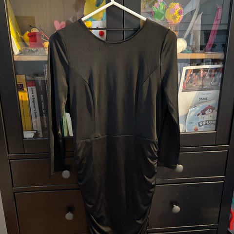 Svart figursydd kjole med belte i livet.
