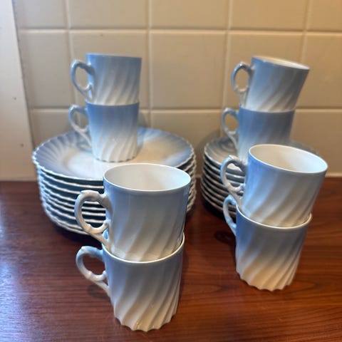 12 stk asjetter, 12 skåler, 12 kopper og 1 kaffekanne selges. Nesten ikke brukt. I god stand. Hentes av kjøper. Kan ikke sendes.