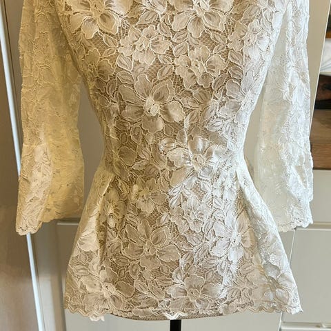Selger denne nydelige blondetoppen med 3/4 lange trumpetermer billig.
