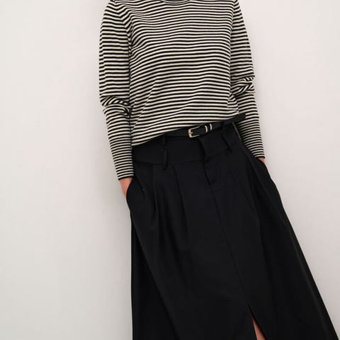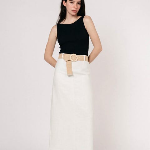 Fint og anvendelig dongeri-skjørt i kremhvit denim. To lommer foran, to lommer bag og splitt foran. Str. 38, normal i størrelsen, måler 40cm tvers over linningen, ca 53cm tvers over ved hoftene og lengden er 90cm.