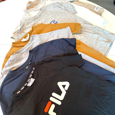 Str i t-skjorta står 146-152 (den er utrolig liten i størrelse, så vi måtte bestille ny da 134-140 tilsvarte 128ish)
