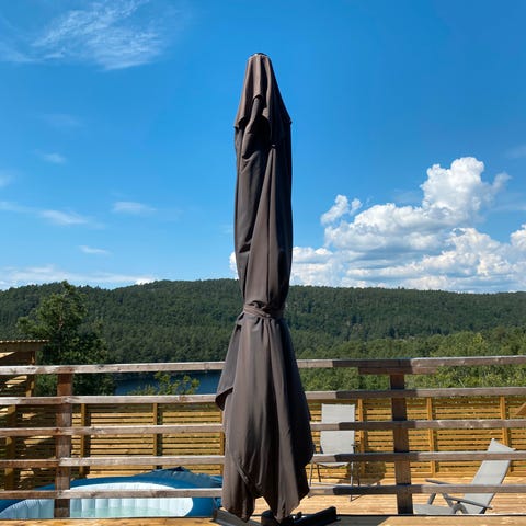 Parasoll med vekt til foten.