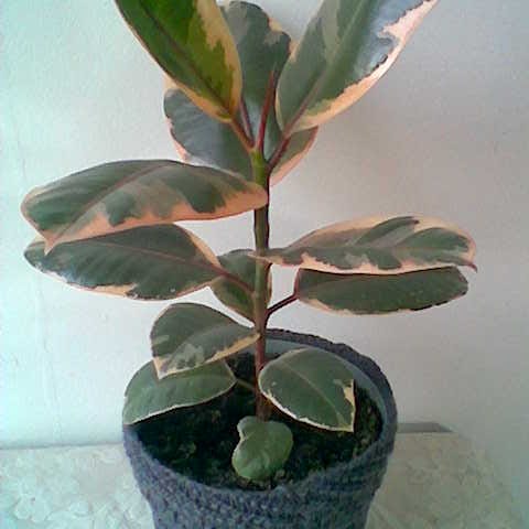 Vakker Ficus med fargespill - planten kr. 100 - ny strikket potteskjuler kr. 75