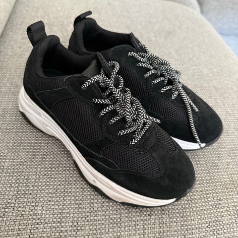 Svært lite brukte Hermes joggesko i svart - selges med kvittering, ekstra par med lisser, eske og pose. Kan sendes mot at kjøper dekker frakt. Utrolig gode og behagelige sko - fine å bruke på jobb, ferie eller til trening.