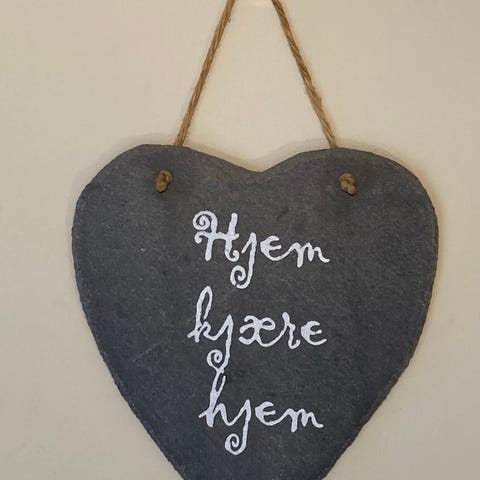 Skifertavle, kan tegnes/skrives på med kritt, har to hull til å henge på veggen.