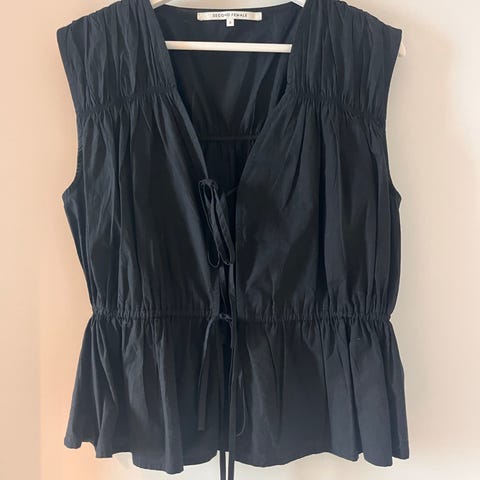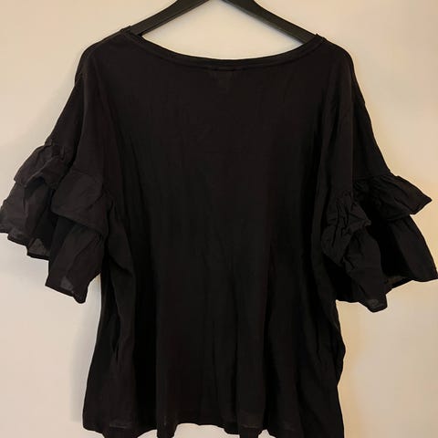 Helt ny og ubrukt topp i 100% viscose fra Second Female. Toppen er i sort farge og har en naturlig rynkete effekt. Halv armlengde og med litt utsving nede.