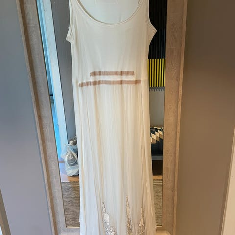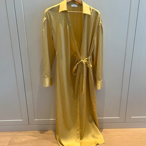 Nydelig gullfarget silkekjole, spesialsydd og kun brukt én gang i et bryllup. Laget i et lett og delikat silkestoff som faller utrolig fint. Passer perfekt til både bryllup, sommerfester og andre spesielle anledninger