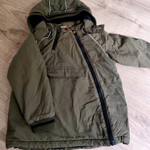 Selger vinterjakke str 110/5 år fra Hust & claire. Avtagbar hette og lomme foran med knapper.