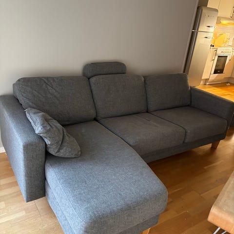 Pent brukt sofa med grått trekk. God å sitte i . Plass til tre. I god stand , oppdaget etter hvert at vi hadde fått to venstrebein fra fabrikanten, men funksjonen er like bra (se bilde)
