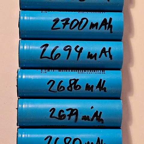 Brukt litium-batteri fra kvalitetsprodusenten Eve. Disse er sikringsløse og krever BMS (Battery Management System), altså en krets som utnytter og beskytter batteriet best mulig. mAh-tallet påskrevet er hva laderen brukte av strøm for å lade batteriet fra tomt til fullt, ved 4,2 volt. Nominell verdi er 2550 mAh, 6 A og 15,3 W. Veier 46 gram. Holdt seg innenfor 35 grader celsius ved lading på 500 mA. Lagres rundt 40 % kapasitet, for bedre holdbarhet, inntil videre. Det har en sprekk i PCV-strømpen, oppe ved pluss-polen; dette kan enkelt fikses med elektriker-tape.