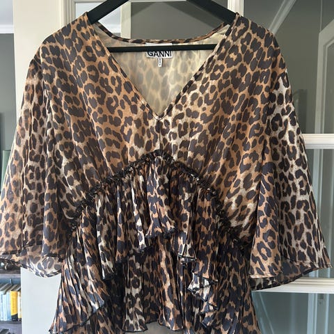 Utrolig kul bluse i svart/brunt mønster fra australske Sheike i størrelse 12, tilsvarende en europeisk 40. Blusen har knapper foran og et fint snitt. Blusen har en avtagbar krage/skjerf som kan festes med knapper i nakken. Ingen bruksmerker.