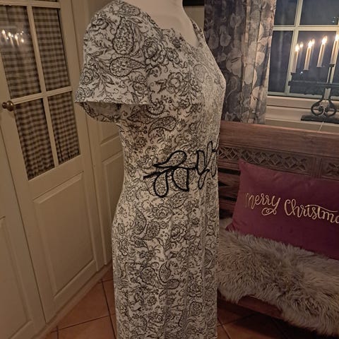 Mål: lengde 103 cm, brystmål 51 cm, liv/midje 52 cm (vid fasong på denne kjolen) Tekstilen har litt stretch!