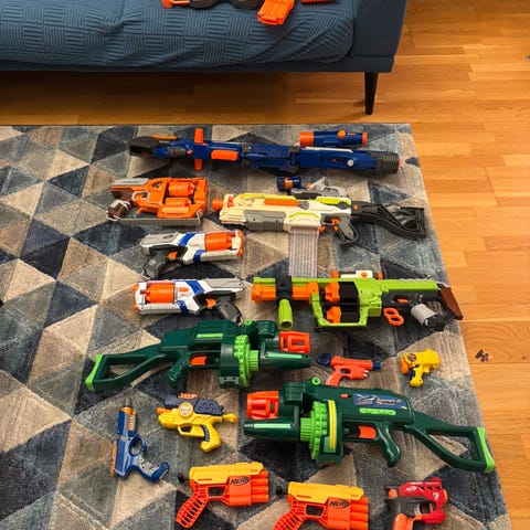 Selges samlet. Kan spille battle ops 2-4 personer samtidig. Mangler et håndtak. Flere blinker og blastere trenger nye batterier.