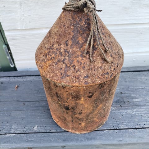 Antikk metallkanne med rustikk design. Laget av metall, viser naturlig aldring og rust. Egnet som dekorativt element. Solid håndtak for enkel transport.