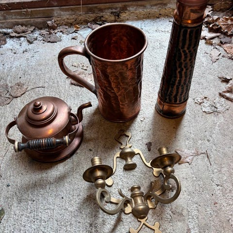 Selger en større samling dekorative gjenstander i messing, kobber, tinn og annet metall. Variert utvalg med blant annet lysestaker, former, fat, potter og skåler. Flere av gjenstandene har klassisk eller retro preg, og passer godt som interiør, pynt eller bruksgjenstander i et nostalgisk eller rustikt hjem.