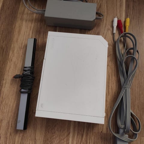 Selger to Nintendo Wii-konsoller samlet. Kun én av dem har strømkabel. Én original Wii-kontroll og et Mario Kart ratt følger med. I tillegg følger det med noen kabler som gjør det mulig å koble Wii til en nyere TV (adapter).