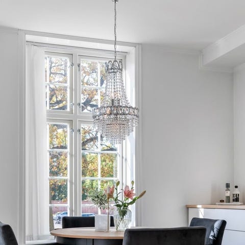 Helt nydelig taklampe formet som en globe med prismer. Sølv/krom farget. Tre pærer av 40W på innsiden. Mulig med dimmer. Lengde på lenke er justerbar.