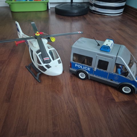 Det er ingen kanoner 3 stk 1 håndjern 1 politihatt og ei feste på Antenne og ingen bruksanvisning resten er fullstendig polizei bilen som ha lyd blå lys og er back litt knekt frakt som kommer i tillegg Jeg sende med en link for å bygge opp den Bruksanvisning Playmobil set 9372 Police Politistasjon https://share.google/V9kSLDwYB08jo7SVb Kan sende med posten frakt koster 140 kr i tillegg